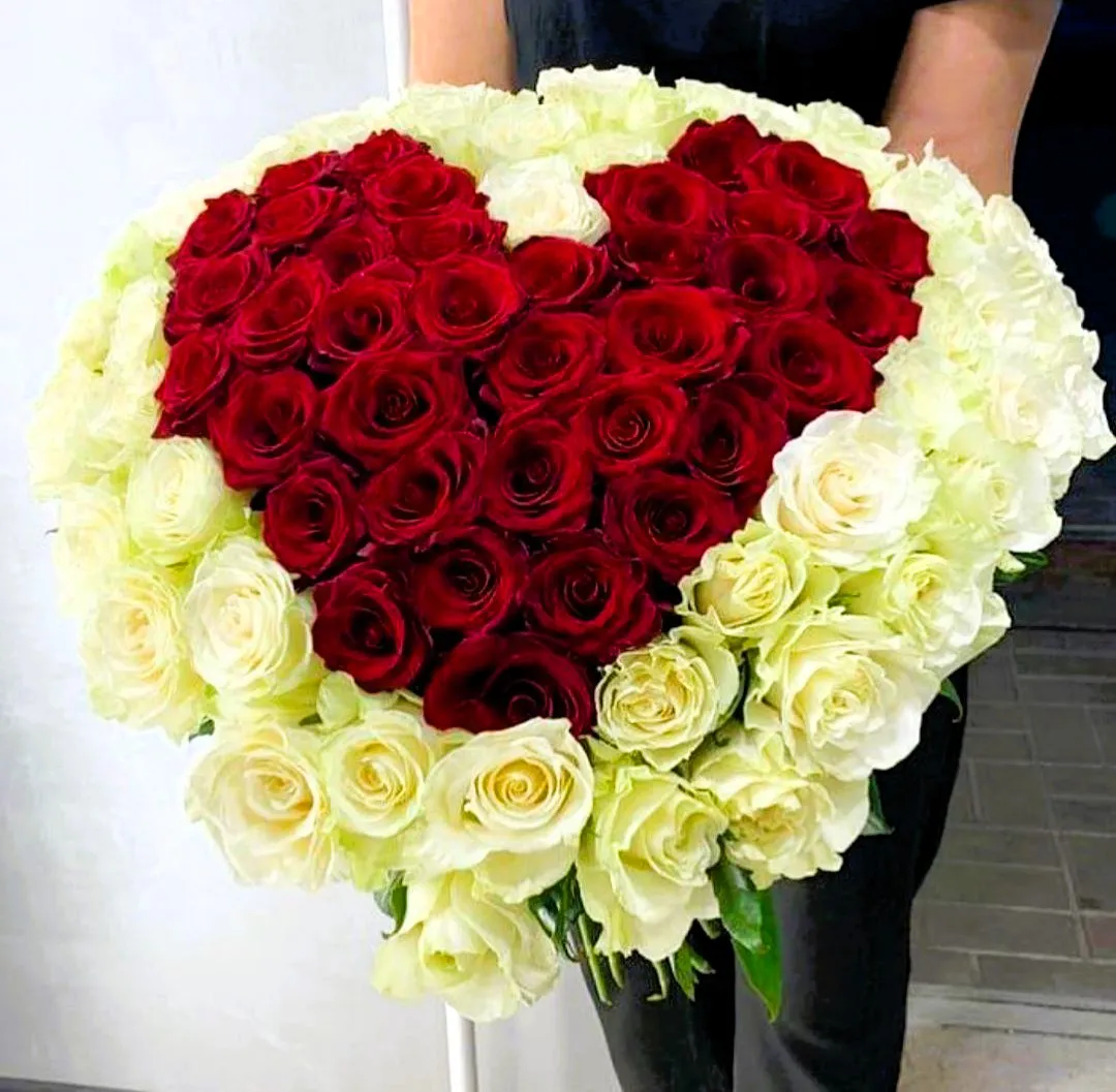 **Ключевые слова:** букет в форме сердца, красные розы, белые розы, символ любви, романтичный подарок, чистота и невинность, День святого Валентина, годовщина, композиций, подарок для близкого человека.