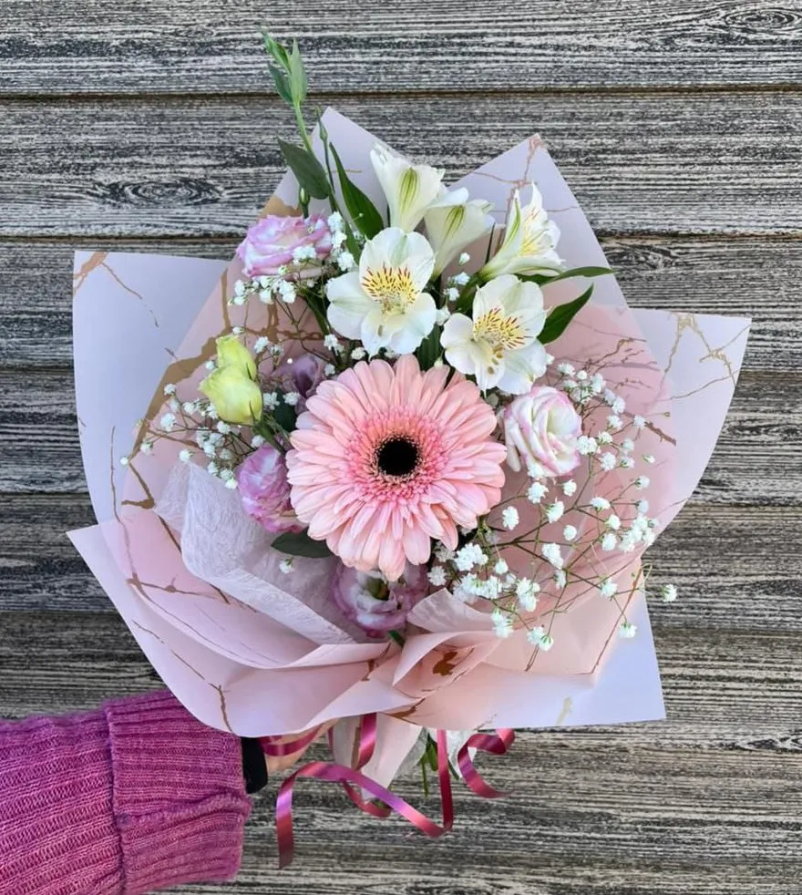 Букет, составленный из гербер, альстромерий, гипсофилы и эустомы, представляет собой яркий и жизнерадостный ансамбль, который способен поднять настроение и создать атмосферу счастья и уюта.