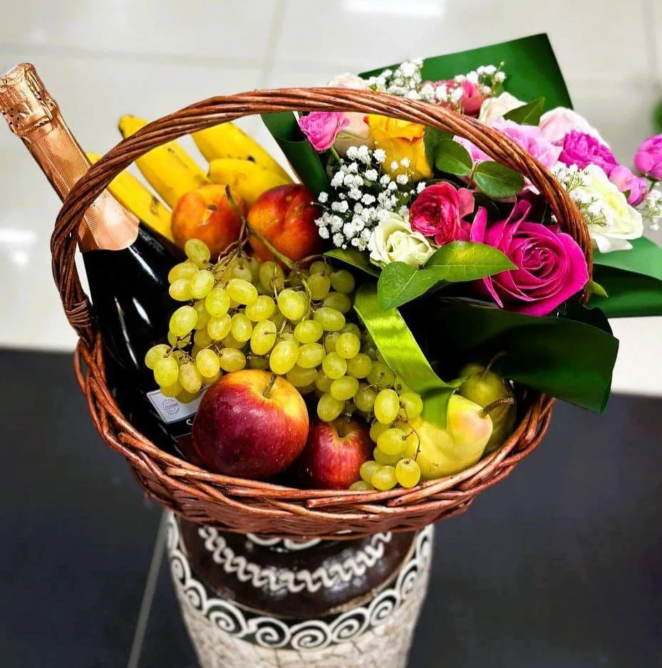 Виноград.яблоки,бананы,груши,напиток (по согласованию)+ цветы |