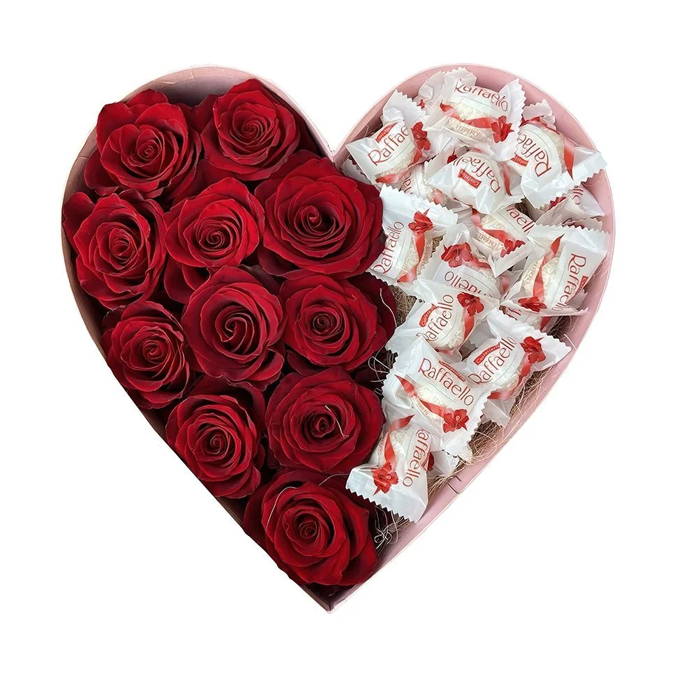Красные розы в коробке сердечком и всеми любимые Рафаэлло. Самая романтичная композиция .