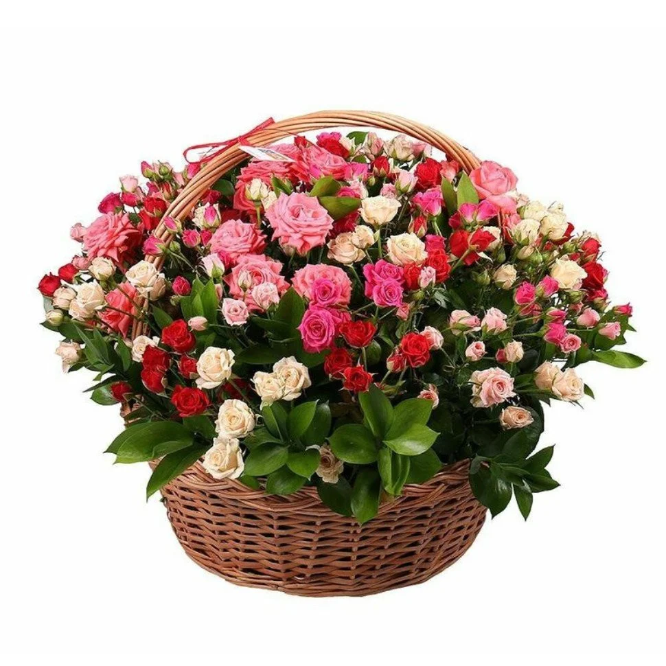 Вариант—Стандарт - кустовая роза - 11 шт., зелень, оазис, корзина
