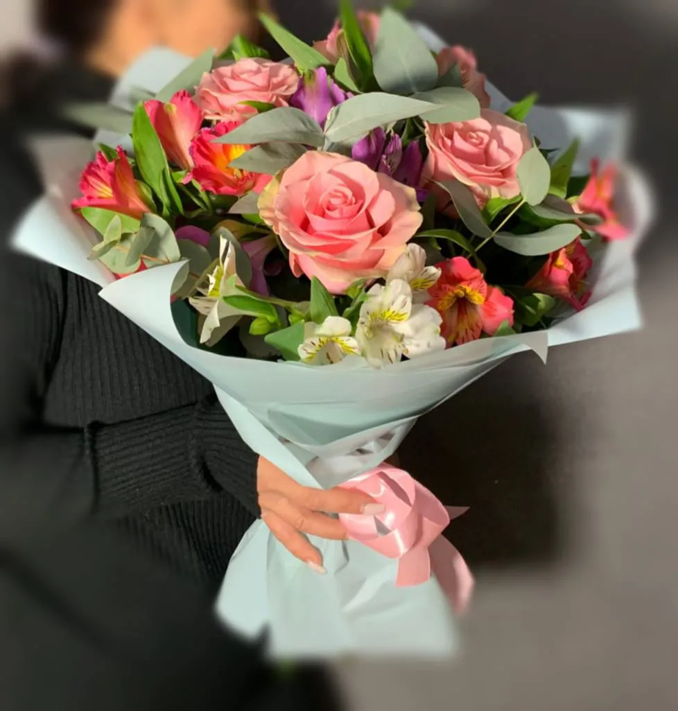 Букет из розовых роз и альстромерий Нежная любовь