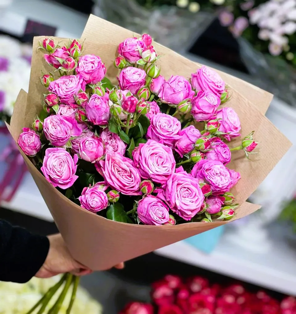 Букет из кустовых пионовидных роз — это настоящий шедевр флористического искусства. Каждая роза в этом букете словно создана для того, чтобы радовать глаз и трогать душу. Цветы обладают нежной текстурой и выразительной формой, что создает эффект легкости и воздушности.
