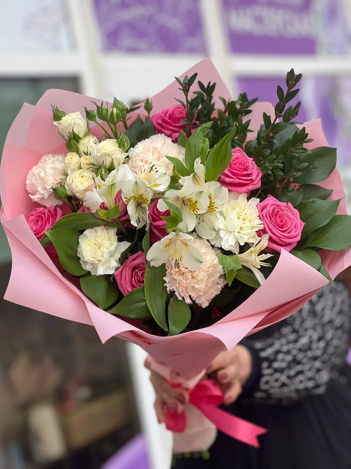Роза, кустовая роза, гвоздика,альстромерия , зелень, упаковка, лента