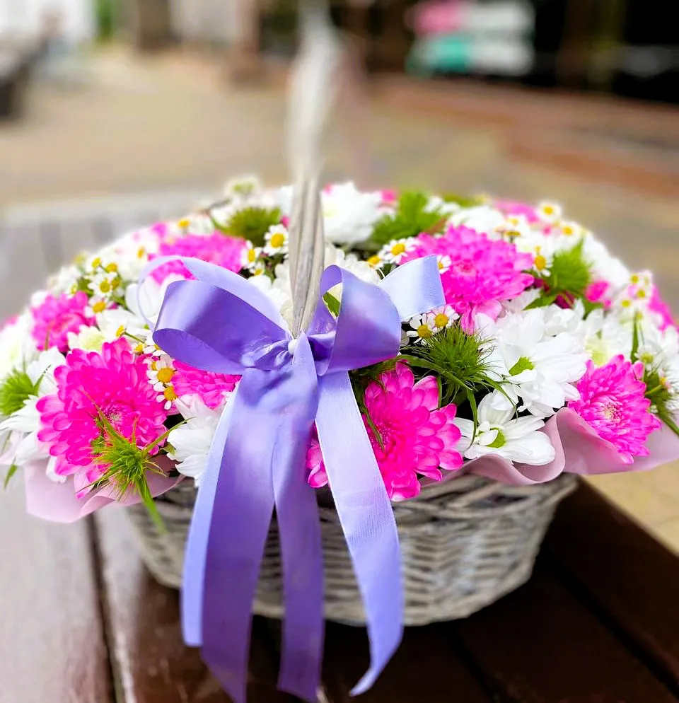 Кустовые хризантемы отличаются своей пышной формой и долгим сроком цветения, что делает их прекрасным выбором для создания ярких композиций. В сочетании с белыми и розовыми оттенками, такая корзина привносит в интерьер свежесть и изящество.