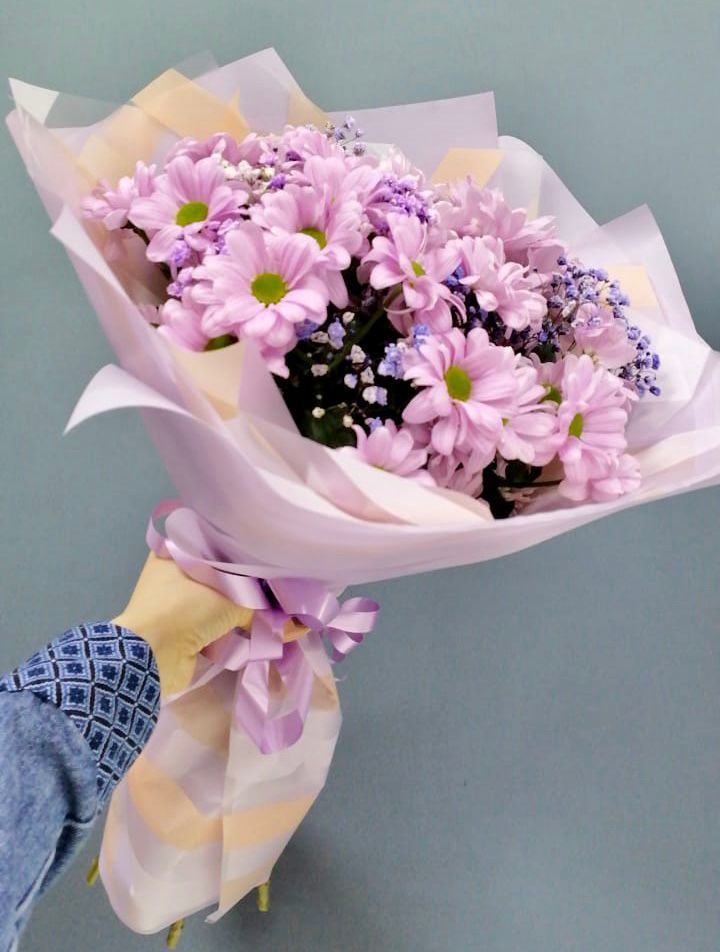 кустовая хризантема , гипсофила , упаковка, лента |