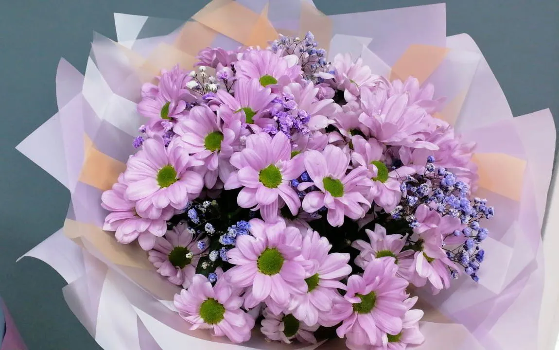 • Стандарт - кустовая хризантема - 5 шт., гипсофила, упаковка, лента
