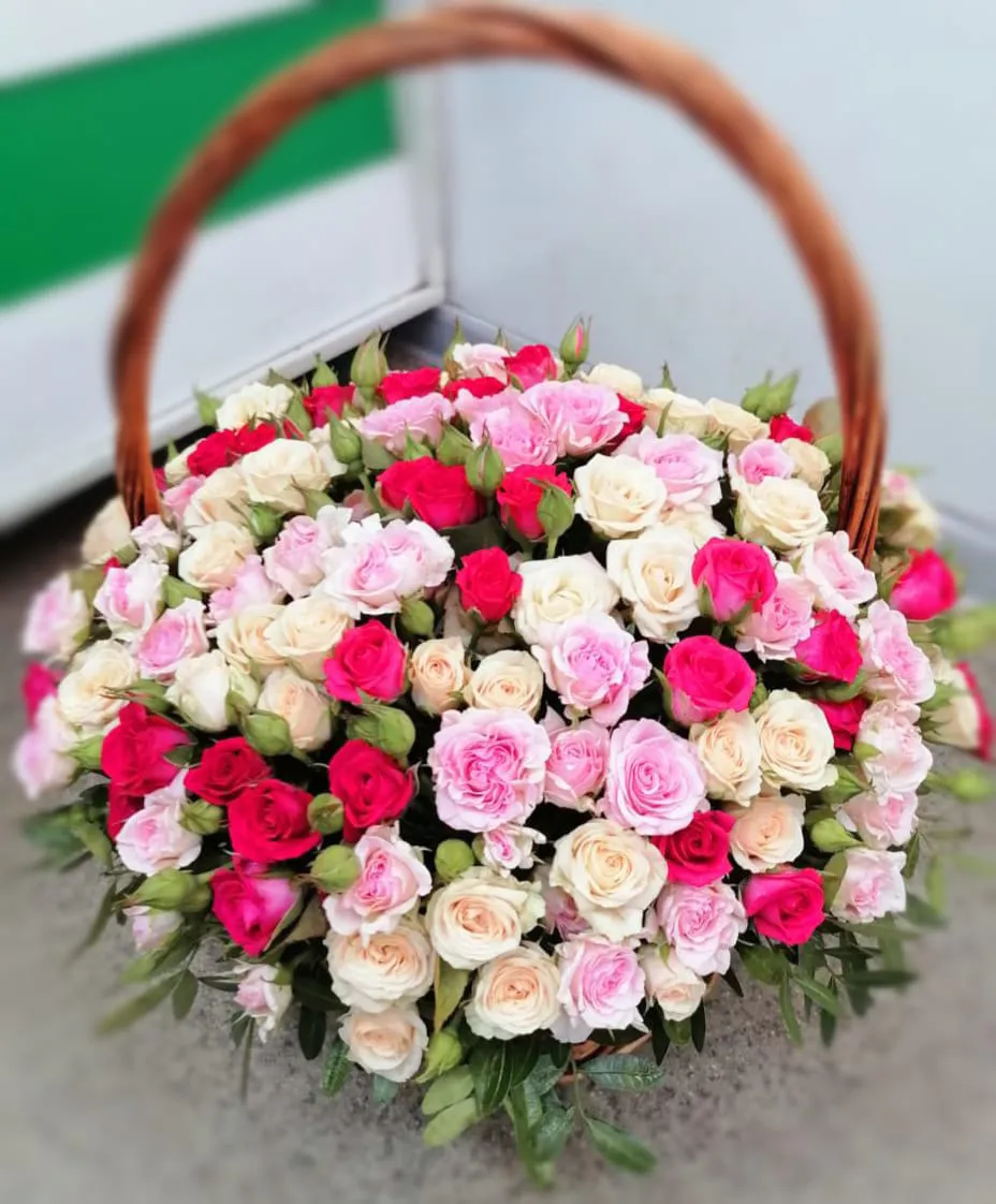 Вариант—Стандарт (кустовая роза - 11 шт., зелень, оазис, корзина)