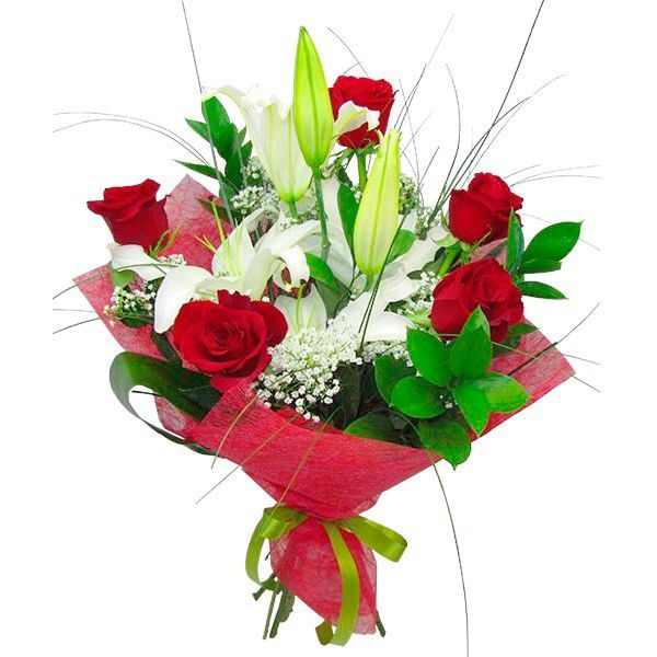 Вариант—Стандарт - роза - 5 шт., лилия - 1 шт., зелень, гипсофила, упаковка, лента