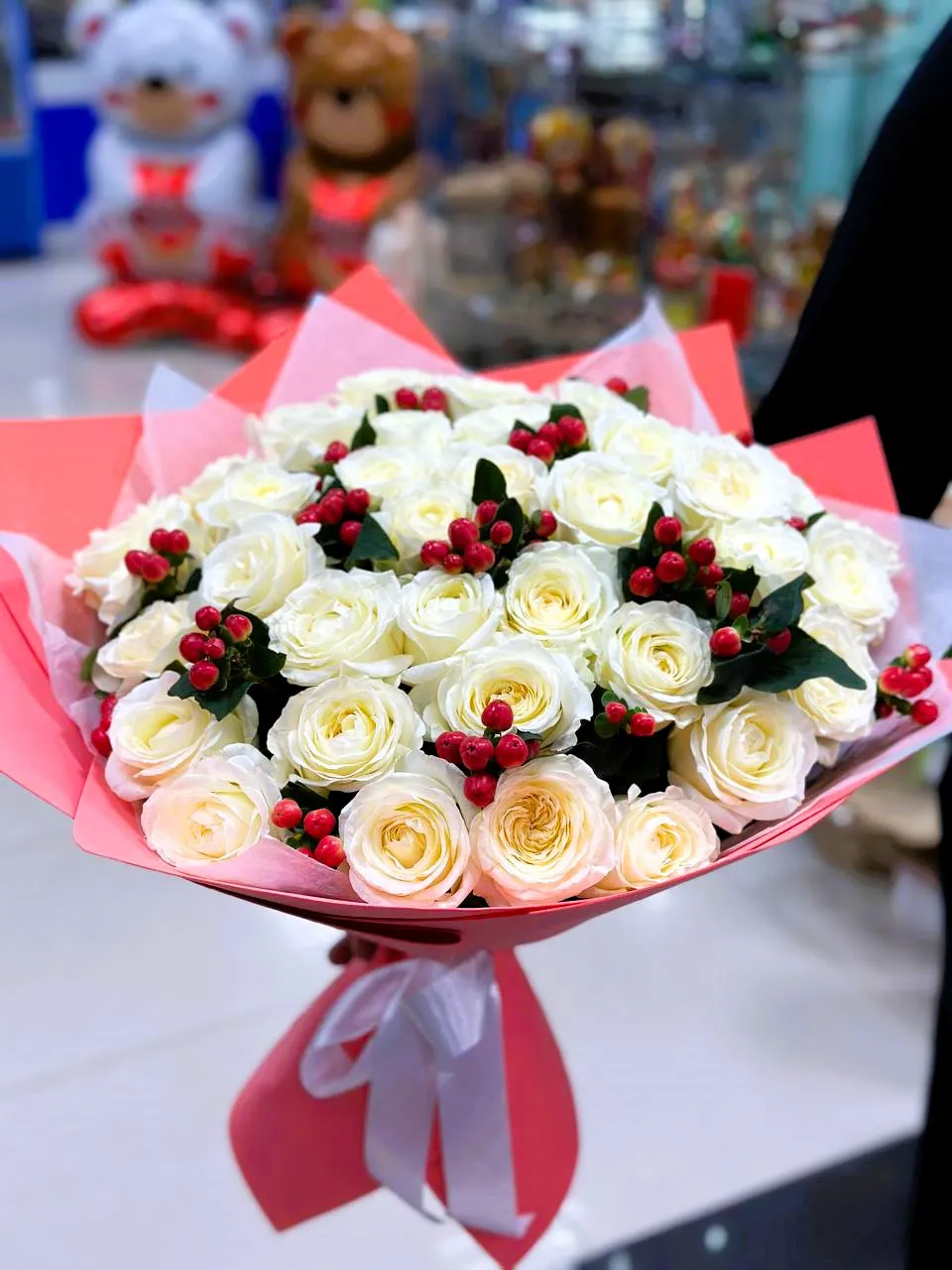 Гиперикум, известный также как зверобой, добавляет букету уникальности. Его красные  ягоды и нежные цветы отлично контрастируют с белыми лепестками роз, создавая гармоничное и красивые зрелище. Этот букет станет не только прекрасным подарком, но и стильным украшением интерьера.
